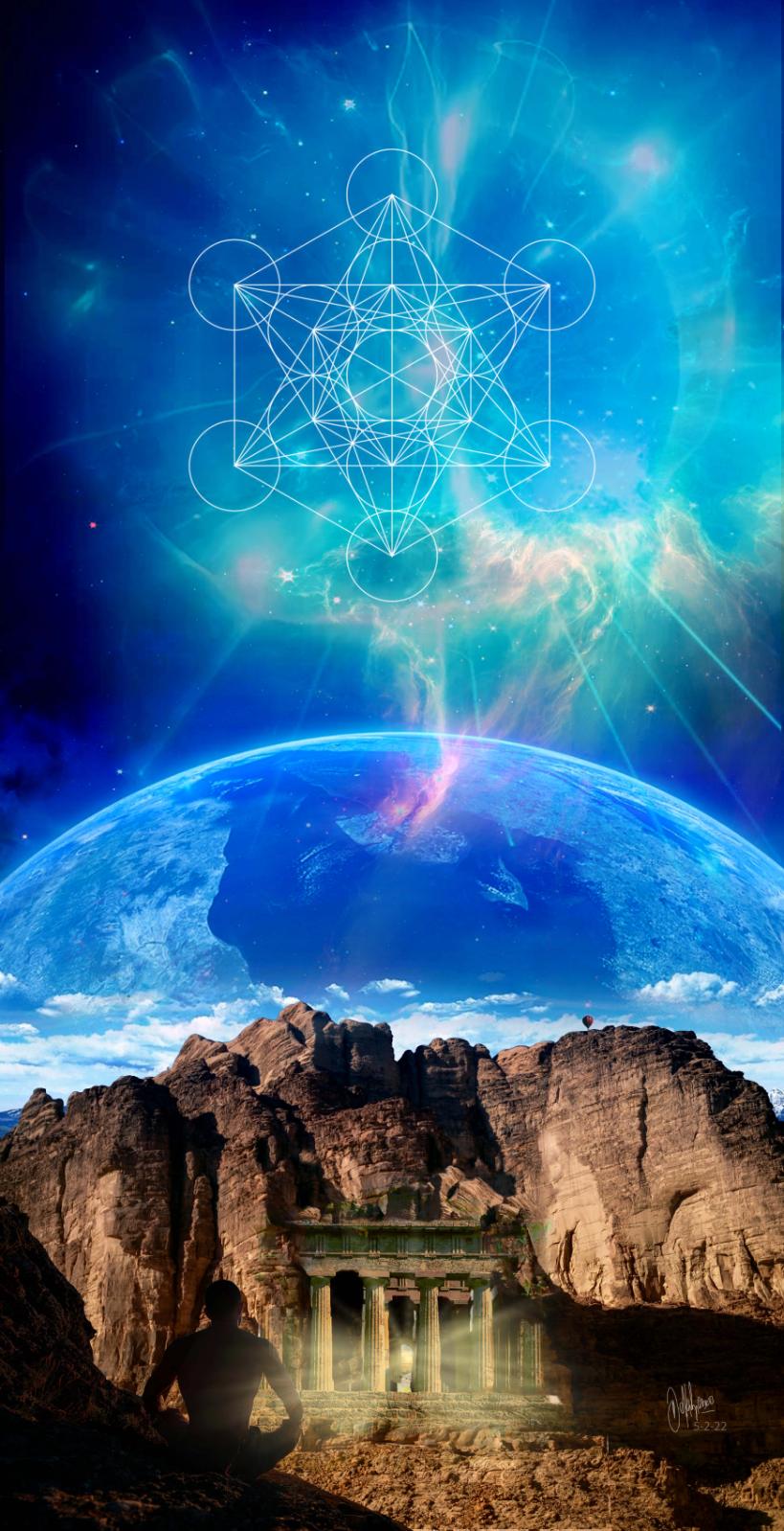 En este estadio de madurez, el buscador deja de ser un mendigo de verdades externas para convertirse en el heredero de su propia sabiduría. La figura que corona el cielo, el Cubo de Metatrón, es la matriz de la creación que contiene todas las formas posibles de la realidad. Al sentarte ante este portal, estás alineando tu mente con la inteligencia pura que organiza el cosmos. Ya no actúas por reacción, sino por diseño. El Templo iluminado es la señal de que has encendido tu propia fuente de luz —la fase de la iluminación interna— donde ya no dependes de la aprobación del mundo para ver con claridad. Es el encuentro sagrado entre lo ancestral y lo cósmico, donde la piedra se vuelve luz y el hombre se reconoce como el eje inamovible de su propia existencia.